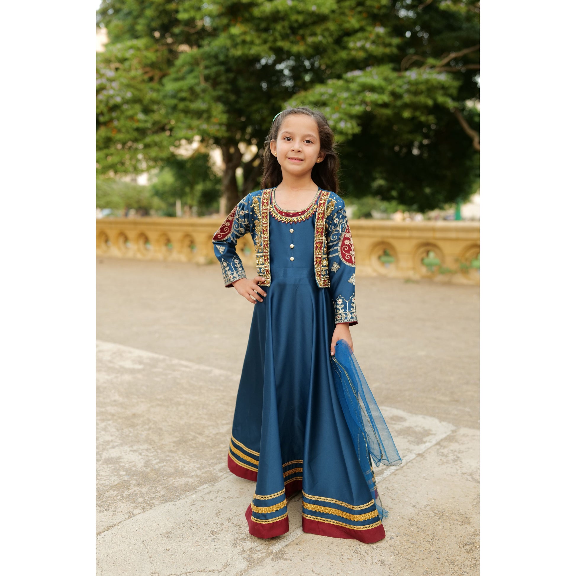 Dark Teal color with embroidery on front body, styled with three quarter sleeves is a promising article in our festive collection. Long length Maxi is accompanied with caprice trouser.