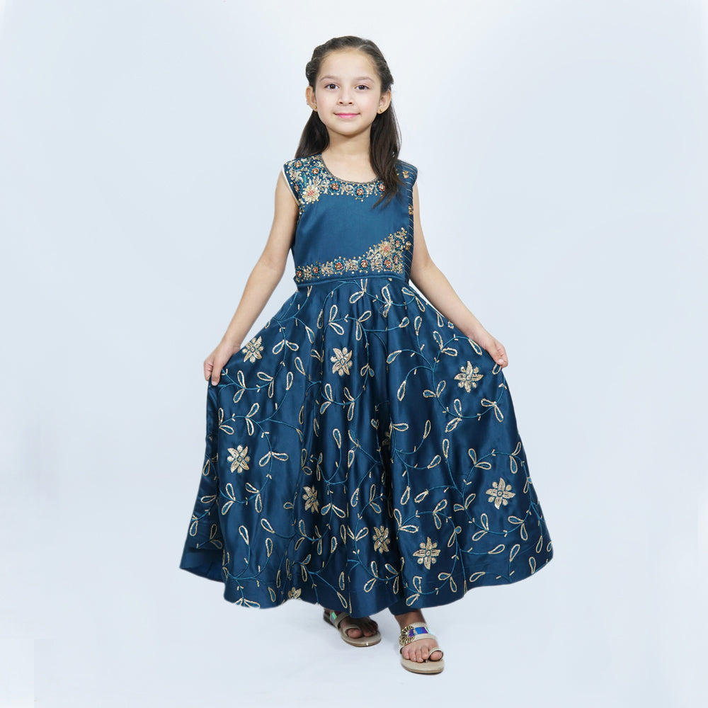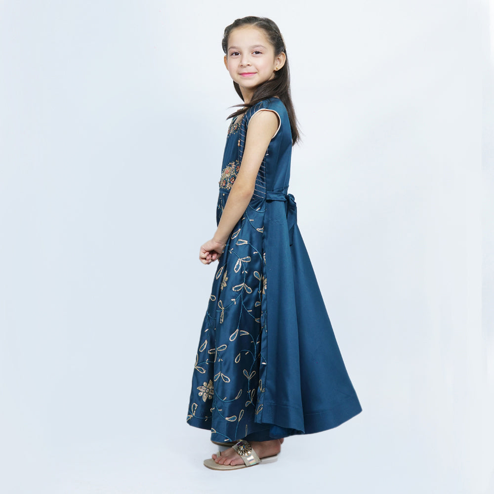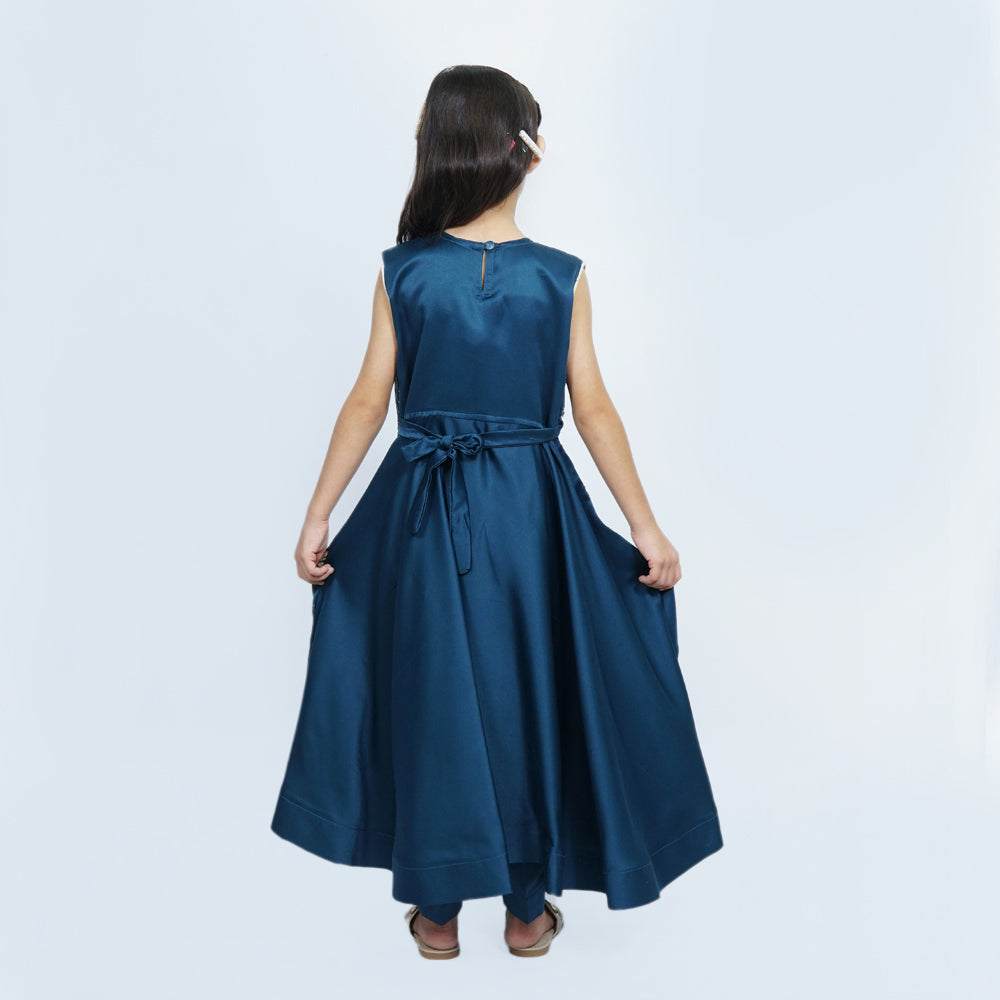 Dark Teal color with embroidery on front body, styled to make your events memorable. Long length Maxi is accompanied with caprice trouser.
